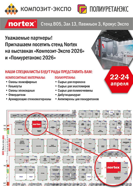 Приглашаем посетить стенд Nortex на выставках “Компзит-Экспо 2026” и “ПОЛИУРЕТАНЭКС 2026”.